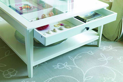 要想在客廳得到更多的空間,應該好好“挖掘”一下茶幾的“潛力”。茶幾的透明桌面下可以帶一個分成好幾格的抽屜,把漂亮的雜志還有原先雜亂無章擺放的小飾品放在里面。這一招不僅讓客廳空間變得干凈整潔,美化了茶幾,還為你的小飾品找到了獨特的“展臺”。
