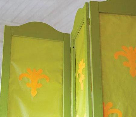 用紙就可以將舊屏風(fēng)修補(bǔ)得煥然一新。把舊屏風(fēng)面拆掉,只留下框架,重新上漆。將薄印花紙按四邊都比原來屏風(fēng)面板大2.5cm的標(biāo)準(zhǔn)剪裁下來,釘在框架后。為了美觀,可以在底部加一層和印花顏色相同的紙。