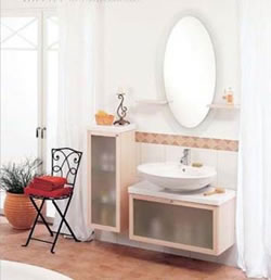 為了迎合人們希望盡可能充分利用空間的需要, 現(xiàn)在很多浴室家具不僅僅具有一項功能,例如圖中所示的坐椅,表面有可以打開的蓋子,蓋子一面是鏡子,可用于化妝,而椅坐里面還可以放一些零碎物品。高一些的帶抽屜的柜子也是如此。