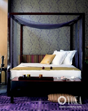 臥室中色調(diào)柔和的布藝床頭莊重典雅而不乏輕松浪漫的感覺(jué),與灰紫色暗花紋壁紙和深紫色的格紋地毯相互呼應(yīng),多層次的色彩變化,中和了深色家具帶來(lái)的冷靜,帶有灰度的柔和色調(diào)讓整個(gè)房間停留在雅致迷人的氛圍里。