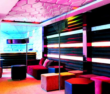 折線與金屬展現(xiàn)出的是設(shè)計師十足的個性與嫻熟的空間把握能力。鮮艷的紫色玻璃足以調(diào)動人們的視覺神經(jīng)。