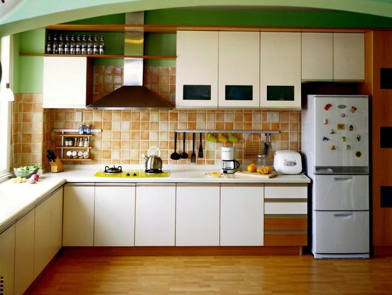小廚房的使用面積有限,在整體色彩安排方面,切忌花花綠綠。特別注意不能使用印有立體感圖案或明暗對比強烈的裝飾材料,否則不僅會使廚房面積在視覺上顯得狹小,而且不易清潔。