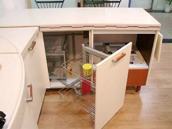水槽下方的柜體空間很大,但空膛的利用率往往不高,因?yàn)橛泄艿溃槐阌诜艛R板,要想有序地碼放東西,就要利用這種凹型抽屜拉籃,凹型口避讓了管道,寬大的抽屜讓取物更方便。