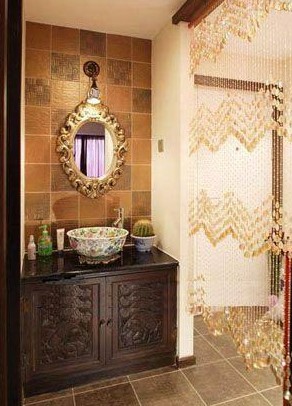 進(jìn)門玄關(guān)處的處理,因?yàn)槭切粜?,所以盡量避免處處封閉,即使是做隔斷,也要做到隔而不斷,也就是說注重通透性,設(shè)計(jì)師在這里大量使用了窗隔和珠簾,既起到了分隔區(qū)域的作用,也增加了觀賞性和透氣性。