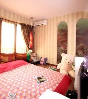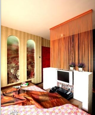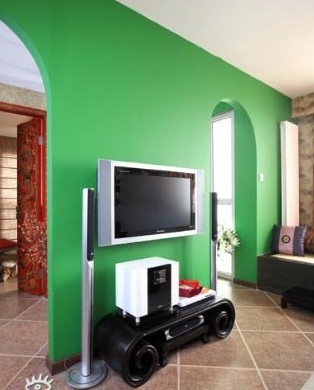 在兩個門的中間設(shè)了一個綠色電視墻,感覺上很新穎,效果也不錯。