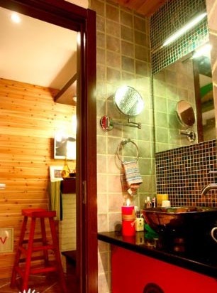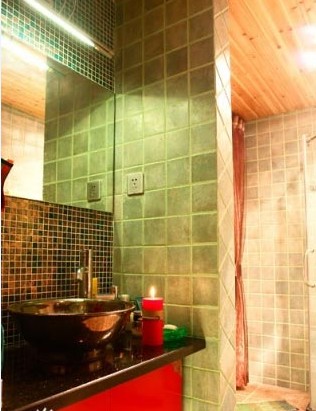 淡綠色小瓷磚,在燈光的照射下,隱隱顯出綠色的光來,這種巧妙的設(shè)計很隱形地形成紅與綠的對比
