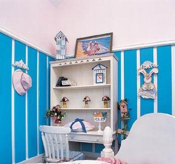 兒童房的裝飾重點(diǎn)應(yīng)該是表現(xiàn)孩子的天真活潑,在藍(lán)白相間的條紋墻裙上加入柔美的粉紅色,整個(gè)房間立刻變得溫馨可愛(ài)。床上用品、桌布和窗簾的各個(gè)細(xì)節(jié)搭配與墻面的顏色非常統(tǒng)一,更讓這小小的空間成為一絲不茍的完美境界。