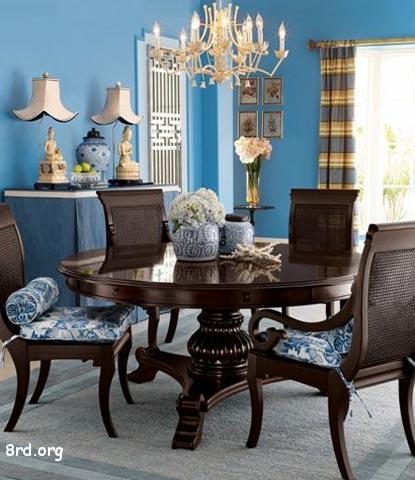 方圓結(jié)合的曲線吊頂與質(zhì)樸的植物纖維燈搭配相得益彰,大膽的色調(diào)更是使這一區(qū)域顯得不再沉悶,完全化解了實(shí)木家具的沉重之感。鏤空的實(shí)木隔斷也緩和了餐廳空間較小的缺點(diǎn),餐廳背景墻上的鏡子裝飾也起到了擴(kuò)展空間的作用。