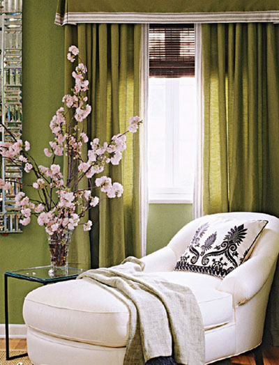 落地窗簾頂部用定制的裝飾帷幔點(diǎn)綴,一方面顯示出家居布置的講究,另一方面可以遮擋窗簾長度不夠長的缺陷,拉長視覺空間。在帷幔下面再安裝一層編織的百葉簾,我們的個(gè)人隱私有了保障。