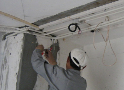 頂面的電線施工已經(jīng)基本完成,而為了保證電工程的質(zhì)量,電工師傅正仔細的對線頭逐個檢查。并將一些管線用膠帶扎在一起,保證吊頂內(nèi)部空間整潔。