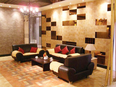 客廳的輪廓以斜插竹桿、磚體屏風(fēng)劃分,豪華的歐式吊燈與熱情洋溢的“威尼斯春天”系列地磚上下呼應(yīng),真皮沙發(fā)套裝,硬木茶幾,墻面是由墻壁上凹凸混鋪的瓷磚和茶色的反光鏡片巧妙的穿插。整個(gè)客廳活潑而不炫亂,更顯現(xiàn)代風(fēng)尚,無(wú)論新朋舊友皆可由衷感受到主人的熱情好客與雍容大方。