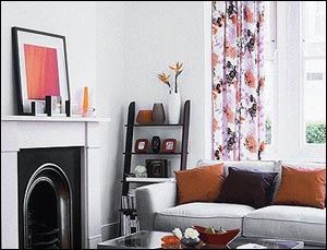 白色的墻面色彩清淡、簡潔,對整體橙黃色調(diào)起到很好的中和作用,純木地板讓現(xiàn)代、輕盈的房間多了幾分厚重。白底橙、黑、灰三色花紋的窗簾在白色背景下顯得別有風(fēng)味?;野咨妓嚿嘲l(fā)搭配數(shù)個橙色和棕色靠墊,宜家的長方小桌上是橙色石質(zhì)花瓶、灰缸形花瓶和船形果盤,造型別致。壁爐架上畫框內(nèi)依然是橙色圖畫,和香蕉形黃色花瓶。墻角的架子上隨意擺放著橙、白、青灰色花瓶和小相框、飾物等。整體空間雖然有大幅的白,但橙色始終都作為主色調(diào)存。