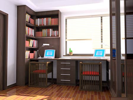 無論書桌與電腦臺是否連接,“L”形的臺面是最適合工作與上網(wǎng)的工作臺首選方案。臺面下一定要有一個足夠大的鍵盤架,最好能放得下鼠標(biāo),為了能讓雙足有充分的伸展空間,臺面下能空則空,最多加一個小推柜即可。如果有空間,在電腦臺旁擺放一個半高的小文件柜或書架,或是在工作臺的墻面上搭幾塊隔板,就會讓文件、書籍、光盤的拿取變得輕而易舉。