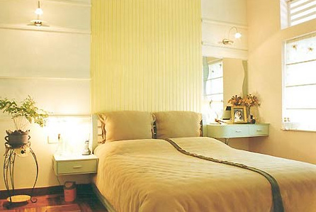 在床頭的一邊或兩邊,距墻約二十到四十公分的位置,豎一塊高大的板材,內(nèi)藏床頭燈,造成一個虛幻的空間,使床頭部分更加富有擴(kuò)張、神秘的魅力。