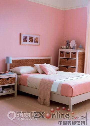 巧妙與鮮明 粉紅色的墻面定下整體基調(diào),給人以朦朧的浪漫感覺。Crucial Trading 的灰白色羊毛地毯,以及Harlequin 白色窗簾與粉紅色過度十分自然。白色的床邊小桌和柜子仍然帶藤制抽屜,桌上放有藍(lán)色托盤和藍(lán)色臺(tái)燈,是整體色調(diào)中活潑的一筆,柜子上飾以小圓鏡、藍(lán)色花瓶和小花枝。灰白色的床上覆以Laura Ashley 粉紅色的床罩,白色床單、白色枕頭、藍(lán)、粉色小靠墊,溫暖而舒適。