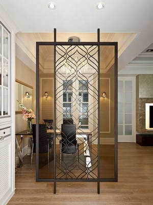 從這個面看餐廳有點兒若隱若現(xiàn),這要歸功于這一款鐵藝的玻璃屏風了。玄關(guān)處與餐廳間擺放這樣一個做工精美的陋斷,既不影響空間又能做到拉高層次,壁面則以仿布板壁紙和畫框境搭配,華麗的吊燈反射出放大空間的效果。