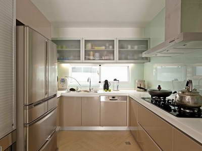 ?。ⅷ牵⑿偷膹N房強化收納功能及使用動線,選用了方便清理的仿木紋地磚,搭配溫暖色系廚具。這個廚房的主婦很具巧手。