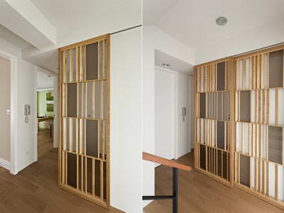 樓梯間以兩片木作移動式屏風巧妙遮擋了廁所門,木制的線條有特殊的景致。既增加了空間美感,又讓整體設(shè)計更上一個層次。