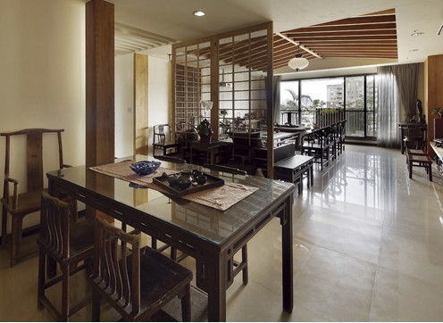 其中運用竹簾拉門、隔屏所圍塑的客廳一隅,以姿態(tài)古雅厚實的羅漢床為主題,規(guī)劃為舒適宜人的休閒區(qū),透過室內(nèi)半穿透元素的巧妙運用,有效延伸了視覺的轉(zhuǎn)折。