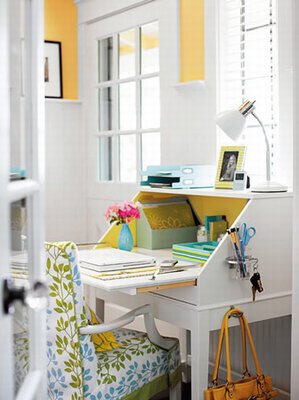 聰明女人的辦公桌一定是整齊而多功能的,這里可以掛起你的錢包或者公文包,處理電子郵件,把第二天要帶去公司的文件擱在這里,出門的時候也一定不會忘記。頂層的文件盒也是最明顯的地方,裝一些你想看得見、記得帶的東西,比如需要郵寄的信件。下面的文件夾裝一些經常處理的文件,比如賬單。桌面上的托盤盒裝手機、ipod等小物件,盒子外圍可以用絲帶稍微點綴一下。桌子側翼用來放筆的牙缸架和掛鑰匙的S形鐵鉤功不可沒,而桌邊掛衣鉤的出現讓手包和公文包在使用時垂手可得。