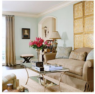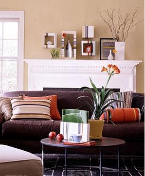 把墻面漆成可可色,整個(gè)空間立刻變得很有時(shí)尚味道,并且在壁畫、條紋沙發(fā)和地毯上也加入相同色彩的局部呼應(yīng),獲得視覺(jué)上的協(xié)調(diào)性。選擇粉色作為次配色,應(yīng)用在地毯、臺(tái)燈、靠墊上,不但可以中和可可色的深重,還能起到提亮空間色彩的作用。