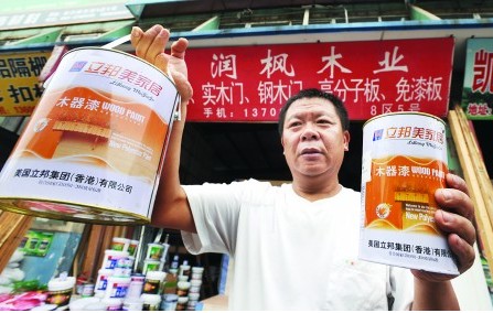 為給兩套新房裝修,經(jīng)熟人介紹,閆繼民認(rèn)識(shí)了包工頭楊某。5月28日,在楊某的介紹下,閆繼民來到新白鶴裝飾材料市場魏某的店鋪里購買裝飾材料。由于對(duì)裝修材料一竅不通,也是出于對(duì)楊某的信任,閆繼民按照包工頭開出的材料單一口氣買了12881元的裝修材料。其中就包含8組“立邦美家居”的木器漆,每組價(jià)格300元。在木器漆的外包裝上注明“美國立邦集團(tuán)(香港)有限公司”。