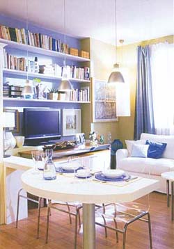 在這35平方米空間里可說是五臟俱全。一張餐桌、六把餐椅,占據(jù)了客廳的所有活動空間,但有了可伸縮的餐桌,在不聚餐的時候,客廳里的活動空間可被完整地還原。金屬結(jié)構(gòu)、橡木臺面的餐桌搭配半透明水晶外殼的椅子,布置出簡潔的就餐領(lǐng)地。準(zhǔn)備若干把可折疊的椅子是必要,方便就餐客人人數(shù)的增減。白色的桌布、藍白兩色的餐具干凈清爽??臻g雖小,與朋友相聚的快樂卻一點都不會減少。