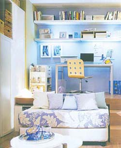 地臺之上,設(shè)計了一個藍色的小書房,緊靠書房的沙發(fā),就是隱藏在地臺內(nèi)部的雙人床。白天,推進地臺的雙人床是一個舒適的沙發(fā),與另一個白色沙發(fā)以及小茶幾圍合出一個其樂融融的沙發(fā)區(qū)。到了晚上,收起茶幾,將雙人床拉出地臺,一張舒適的大床躍然眼前。
