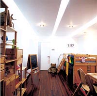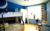 例如床上方的月亮,仿佛正在編制著一個多姿多彩的夢,并讓孩子的夢想插上翅膀,盡情飛翔。由于已經(jīng)上學(xué),這時孩子的房間多了一些電器,因此在書架上、窗臺上擺上一兩簇花草,調(diào)節(jié)屋內(nèi)空氣。