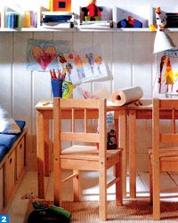 為保證男孩的身體健康,兒童房中的家具都選用環(huán)保的實木家具,并鋪設(shè)實木地板。因為男孩年齡小,又好動,設(shè)計師選用了一張低矮的兒童床,以免孩子睡覺時“不老實”而翻下床。