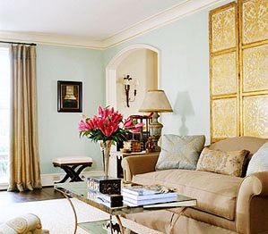 金碧輝煌的感覺不少人都喜歡,但是太多的金屬色反而會影響房間感覺。主體色彩選用單色,而在家具的周邊使用金色鑲邊,以及具有金屬色的窗簾,都能使客廳豪華而具有魅力。