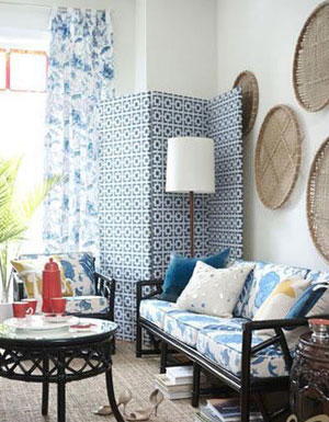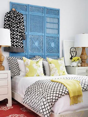 4、竹制的屏風(fēng)噴上了淺藍(lán)色,代替了原來(lái)的床頭板,并且讓視線(xiàn)上延,強(qiáng)調(diào)了房間天花板的高度。