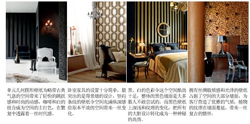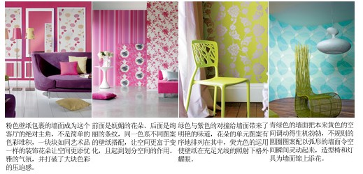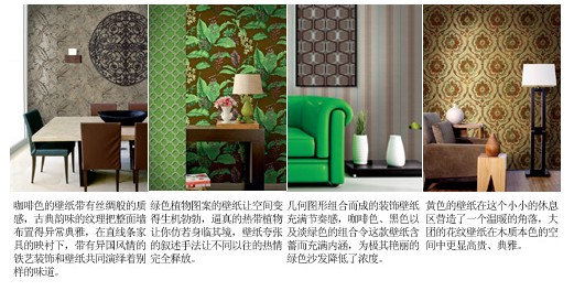 整體效果:壁紙的色彩十分廣泛,不同材質(zhì)的壁紙可以產(chǎn)生不同的色彩氛圍和質(zhì)感,紙基壁紙和PVC壁紙比較普遍,色彩眾多,容易清潔;而織物壁紙和植物壁紙?jiān)诹Ⅲw感的塑造上比紙基壁紙要略勝一籌,但是清潔起來(lái)比較麻煩,凹凸紋理的細(xì)節(jié)需要在保養(yǎng)上下一番工夫;其它的壁紙,如金屬壁紙、熒光壁紙可以產(chǎn)生一些特殊的效果來(lái)裝點(diǎn)房間。和絢麗色彩相映成趣的當(dāng)然是壁紙上的圖案,最常見(jiàn)的使用方法是在整體氛圍確定后,以局部點(diǎn)綴一些帶有花紋的裝飾圖案,把人的視覺(jué)重點(diǎn)自然地過(guò)渡到帶有圖案的墻面上,令鮮亮的色彩和各種圖案完美地融合在一起。