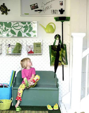 2、這是個(gè)(專門存放濕衣物或沾泥衣物的)沾泥物品寄存室,一個(gè)灰綠色的長(zhǎng)椅與這個(gè)空間中其他元素一起創(chuàng)造出令人愉悅的清新感覺(jué)。