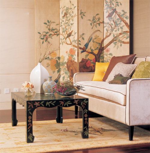 明亮清新的起居室,在多樣的風格素材下,創(chuàng)造出富麗堂皇的視覺美感,散發(fā)著無限的想象力與設計感。而素色沙發(fā),用簡單的咖啡色線條勾勒著絨布的面,與之對比的是茶幾漆面上深沉的花樣暗紋;背景,枝藤蜿蜒盤繞的華麗屏風,孔雀低身親近綻開的牡丹。玻璃花器的光影變換與素燒瓷瓶的隱約釉痕,則靜靜地吸引著人們的目光,是目不暇給視覺旅程中停頓的休止符?;蛴怖拭骺?,或細膩婉約的線條生成了有生命力和表現(xiàn)力的藝術(shù)形式,營造出歡愉的起居室。這個起居室,陳述著東方文人的懷舊和對新時代的向往。