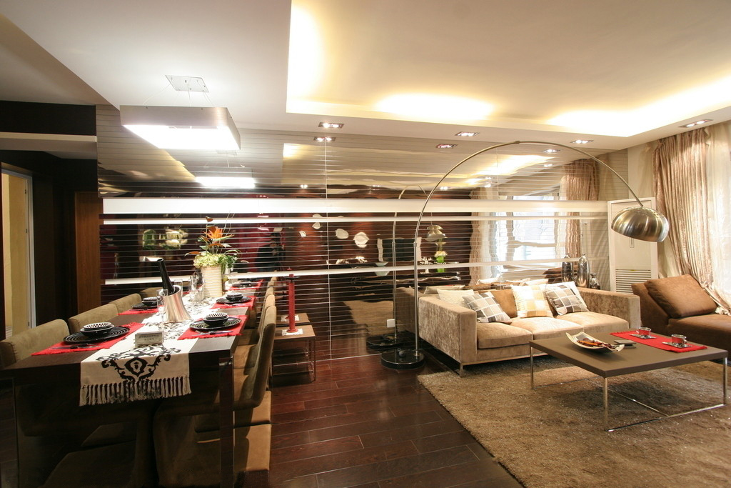 概要: 兩室兩廳的戶型在很多樓盤里面都充當(dāng)著主打?! ∵@是客廳跟餐廳的全景圖,具以現(xiàn)代風(fēng)格為主題。沙發(fā)同餐椅為棕色系,客廳大塊的棕色短毛地毯 配以深咖的實(shí)木板,造型簡潔的茶幾,U型落地?zé)?。中國紅的餐墊是這里軟裝飾的亮點(diǎn),讓現(xiàn)代感更具中國特色?! ≌驹谂P室門口看客廳全景。雖然采取開放式的,但是絲豪沒有影響空間的美感。為了區(qū)別,客廳及餐廳采取不同的吊頂。