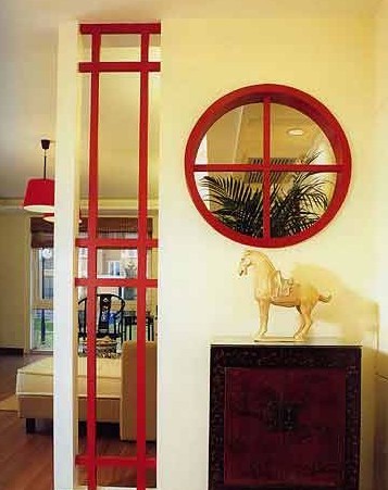 通過(guò)藝術(shù)造景,如假門、假窗、藝術(shù)玻璃、通透方格、玻璃磚隔斷等,使玄關(guān)成為屋內(nèi)的一道屏障。但是這道屏障還要讓人產(chǎn)生錯(cuò)覺(jué),利用視線的折角,創(chuàng)造縱深感,讓每一個(gè)進(jìn)入玄關(guān)的人都有一種懸念和聯(lián)想。所以玄關(guān)在隔斷設(shè)計(jì)上很有文章可做。