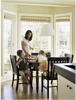 很多家庭都會(huì)在廚房留出空間作為餐廳,那么建議將之布置得越簡(jiǎn)單越好。圖中的餐廳就在廚房一角,主人選擇了簡(jiǎn)單的木拉簾,選用了樣式中規(guī)中矩的餐桌椅。雖然布置簡(jiǎn)單,但干凈利落,使人神清氣爽。餐桌椅角底都是毛氈做成。避免了推來(lái)推去給地板造成的損害。
