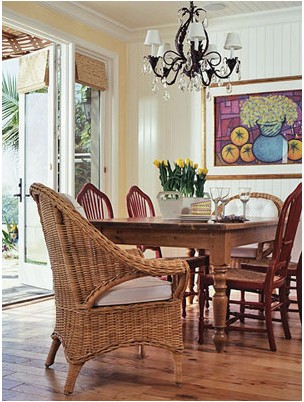 一張看似呆板的白底木面餐桌也能給餐廳帶來(lái)意想不到的活潑效果,簡(jiǎn)單的長(zhǎng)方桌搭配上藤條編制的座椅,使餐廳充滿了原始自然的味道。
