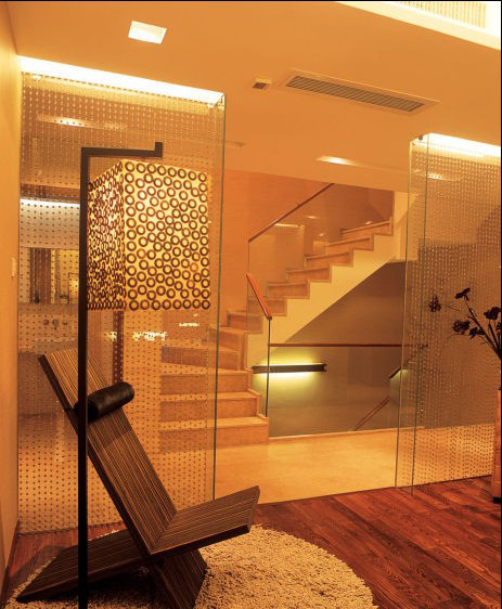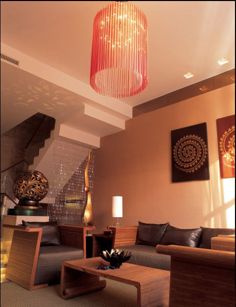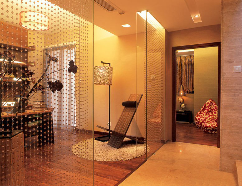 對于居家的要求,業(yè)主希望還是多些溫馨,這樣燈光及軟裝飾品就起到很大的作用了,這里的短毛地毯,水晶珠簾及木質的讀物架很好的說明在