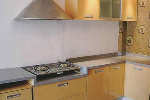 人造石櫥柜臺面,襯板不可少!有的使用條形襯板,有的使用整體襯板,還有的使用一種結構架,不管怎樣,對臺面的保護支撐是必須的。墊板用三條寬100毫米,厚15毫米以上的刨花板或密度板即可,用玻璃膠前中后固定在臺面背面。臺盆和灶口加豎形墊板。全鋪墊板要用防潮板材,以免墊板受潮變形影響臺面。