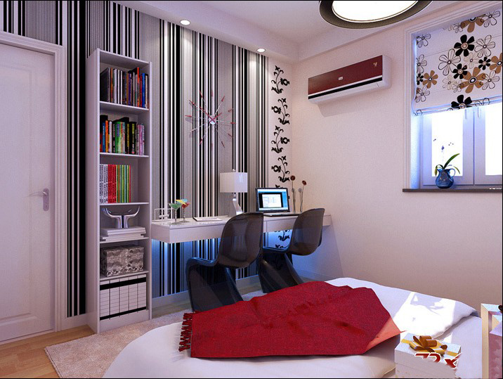 臥室是整個房子里最大空間的一個房間里,它的功能除了睡眠外,還附加書房的功能,設(shè)計合理,有條不紊,空間錯落有致。