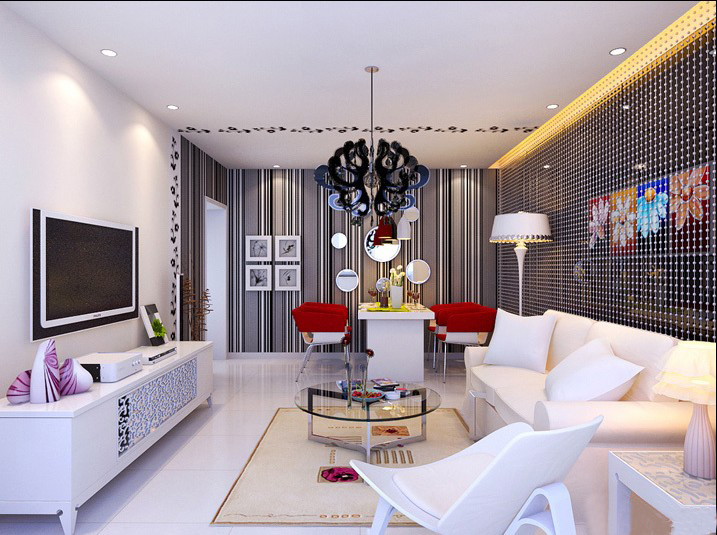 由于空間有限的緣故,客廳和餐廳自然是合二為一的。客廳是家中最主要的活動區(qū)域,它應(yīng)該寬敞、方便。利用大量的烤漆玻璃和白色的家具,讓整個空間在視覺圣桑變得實際上大很多。背景墻采用深色系,同白色相呼應(yīng),空間也得到拉升的效果。