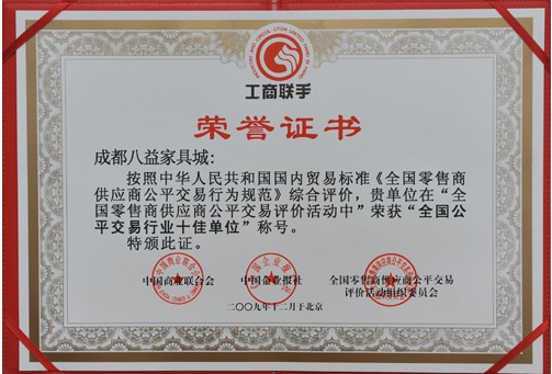 新華網(wǎng)四川頻道12月24日電 由中國商業(yè)聯(lián)合會、中國企業(yè)報社聯(lián)合主辦的“全國零售供應(yīng)商公平交易評價活動”于2009年12月19日在北京全國人大會議中心舉行了隆重的揭曉儀式,成都八益家具城在眾多企業(yè)的角逐中脫穎而出,榮獲“全國公平交易行業(yè)十佳單位”。
