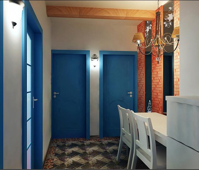 由于門廳采光不好,面積小而且門多,所以在設(shè)計時我考慮以白色為主。出去擺放餐桌的那面墻以為,頂面及四周墻體都使用白色乳膠漆,而剩下的餐廳這面墻,為了突出其功能和闊寬視野,我采用了彩色墻紙和鏡面搭配。門和門套全部使用藍(lán)色,其余家具均采用白色,藍(lán)白搭配,清爽浪漫撲面而來。地面采用地磚,色彩凝重而厚實,頂面為了避免單調(diào)采用木梁搭配,再平添一份自然。