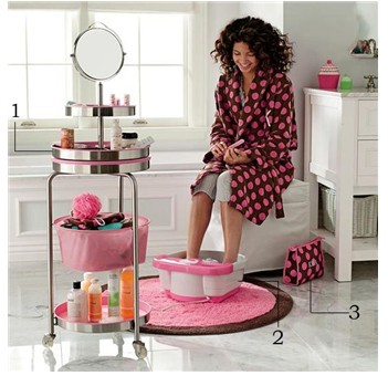 打造手法:包漆皮的鐵絲籃筐防水防潮,適合收納沐浴用品,但卻是冰冷生硬,缺少溫暖感。在里面鋪墊一些懷舊的圍裙或其他漂亮的布品,把布邊搭在籃筐外展示,既好看又充滿暖意。