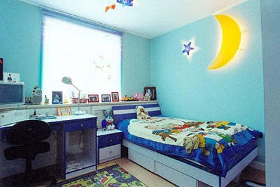 此外,塑膠材質(zhì)的壁板也是相當(dāng)理想的選擇:耐磨易擦,必要時(shí)還可以用水清洗。而淡色的漆彩則是最便宜而富彈性的裝點(diǎn)方式,當(dāng)小孩們覺(jué)得厭煩時(shí),只消再加點(diǎn)壁紙綠飾或模板印刷,便可以輕易地讓房間煥然一新了。