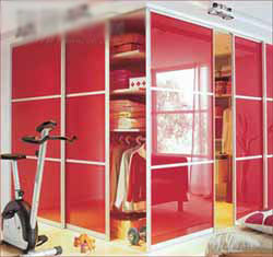 衣柜采用最流行的紅顏色,紅色最能強烈表現(xiàn)并增強直線感和藝術(shù)感。這里使用的5扇滑動門是背面涂了紅色漆的研磨玻璃。因為玻璃能透光,所以衣帽間里不用準備特別的燈光,借助臥室的燈就能把這個3.20米x2.80米的衣帽間內(nèi)部看得一清二楚。而衣帽間內(nèi)部則設(shè)計為井字結(jié)構(gòu)。