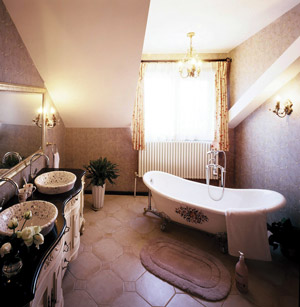 女主人CORRINE是一個讓人感覺很淡定的人,她曾在英國生活過一段時間,因而對于自己的居室空間有獨到的想法。由于夢想在大汗淋漓后能有一個舒服而不受打擾的沐浴環(huán)境,CORRINE決定將原來別墅頂部的閣樓改建為奢華的衛(wèi)浴空間。風(fēng)格則是她偏愛的歐式復(fù)古風(fēng)格,貓爪式獨立浴缸、防水壁紙、雕花洗手臺充分體現(xiàn)了她的品位和喜好。