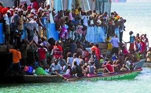 1月20日,災(zāi)民們?cè)谔痈垡粋€(gè)港口登船準(zhǔn)備離開。